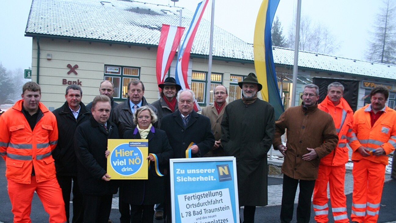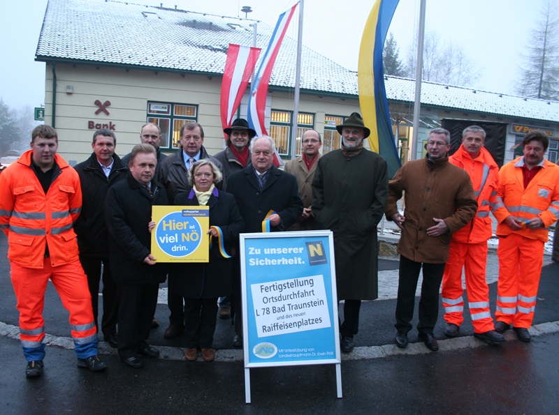 Bgm. Angela Fichtinger zeigt sich über den zahlreichen Besuch zur Eröffnung erfreut. Die neue Ortsdurchfahrt mit den Nebenanlagen wurde im Frühjahr des Jahres in Angriff genommen und konnte nun in einem feierlichen Akt offiziell seiner Bestimmung übergeben werden. Im Zuge der Bauarbeiten bot sich auch die Neugestaltung des Eingangsbereiches zur RAIKA Filiale Traunstein an. LAbg. Franz Mold gratuliert allen Beteiligten in Vertretung von LH Dr. Erwin Pröll zur gelungenen Bauausführung. Mit Unterstützung des Landes NÖ konnte dieses Projekt realisiert werden.