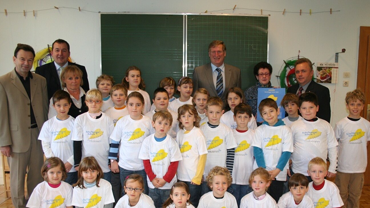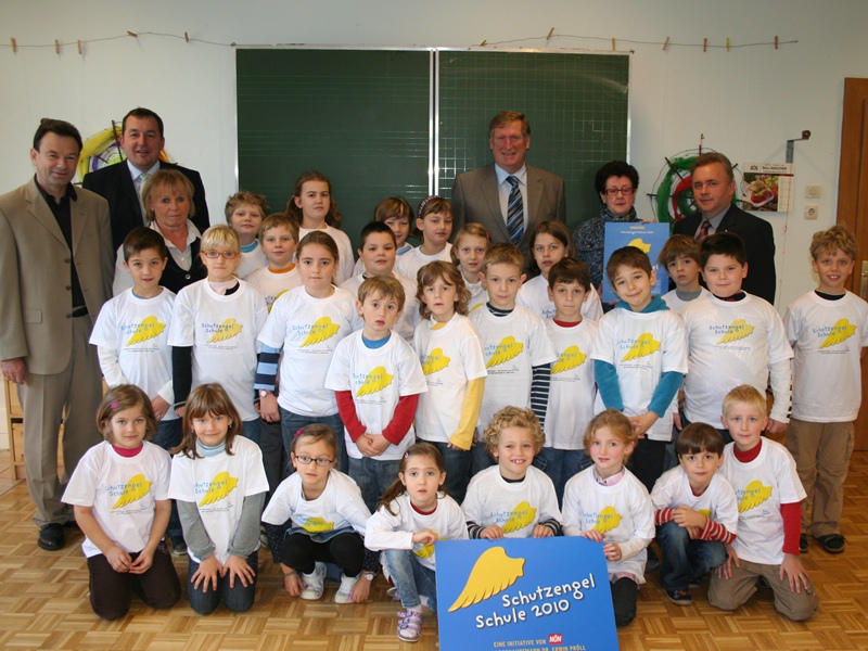 Alle 27 Kinder der Volksschule in Friedersbach nahmen am Gewinnspiel im Rahmen der Aktion Schutzengel teil und applaudieren kräftigst, als LAbg. Franz Mold mit Bürgermeister Herbert Prinz und Gemeinderat Günther Edelmaier den Gewinn zur Schutzengelschule verkünden. Landtagsabgeordneter Franz Mold bedankt sich bei den Kindern für die rege Teilnahme und die Wichtigkeit auf dem Weg zur Schule Gut sichtbar und stets Achtsam zu sein und überreicht die Urkunde zur Schutzengelschule 2010 Direktorin Elisabeth Eichhorn. Initiative von Landeshauptmann Dr. Erwin Pröll.